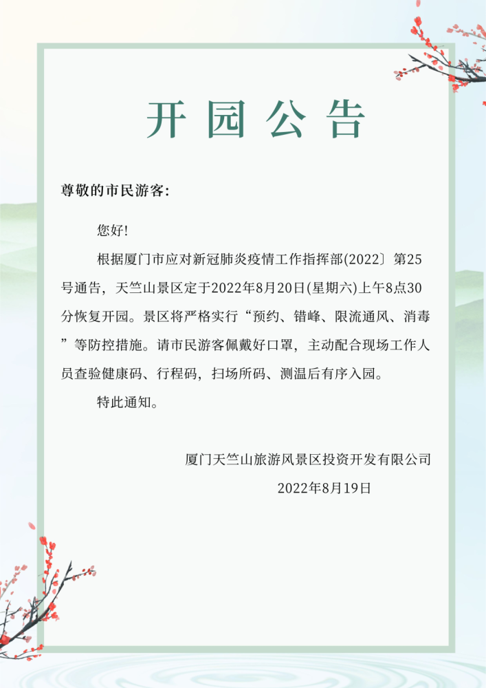 英雄三岛战地观光园于8月20日8:00恢复开园。请市民、游客朋友通过“厦门翔安旅游发展有限公司”微信公众号预约购票,入园时佩戴好口罩,自觉遵守景区各项防疫规定。
