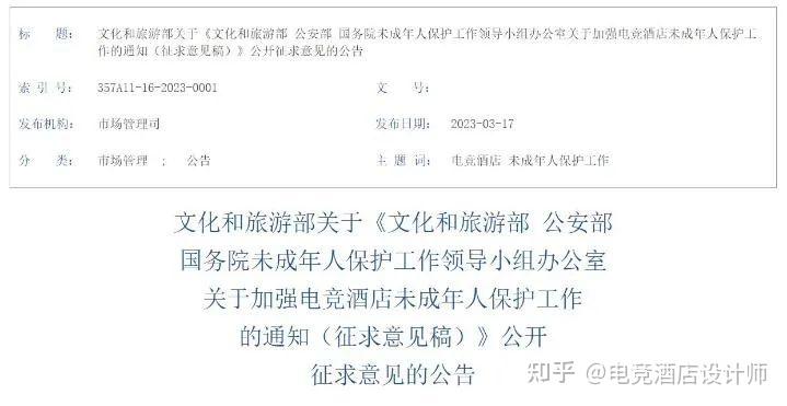 3月17日,文化和旅游部等部门就加强电竞酒店未成年人保护工作公开征求意见,拟规定严禁电竞酒店违规接待未成年人。公众可通过电子邮件、信函等途径和方式提出反馈意见。意见反馈截止到2023年3月24日。
