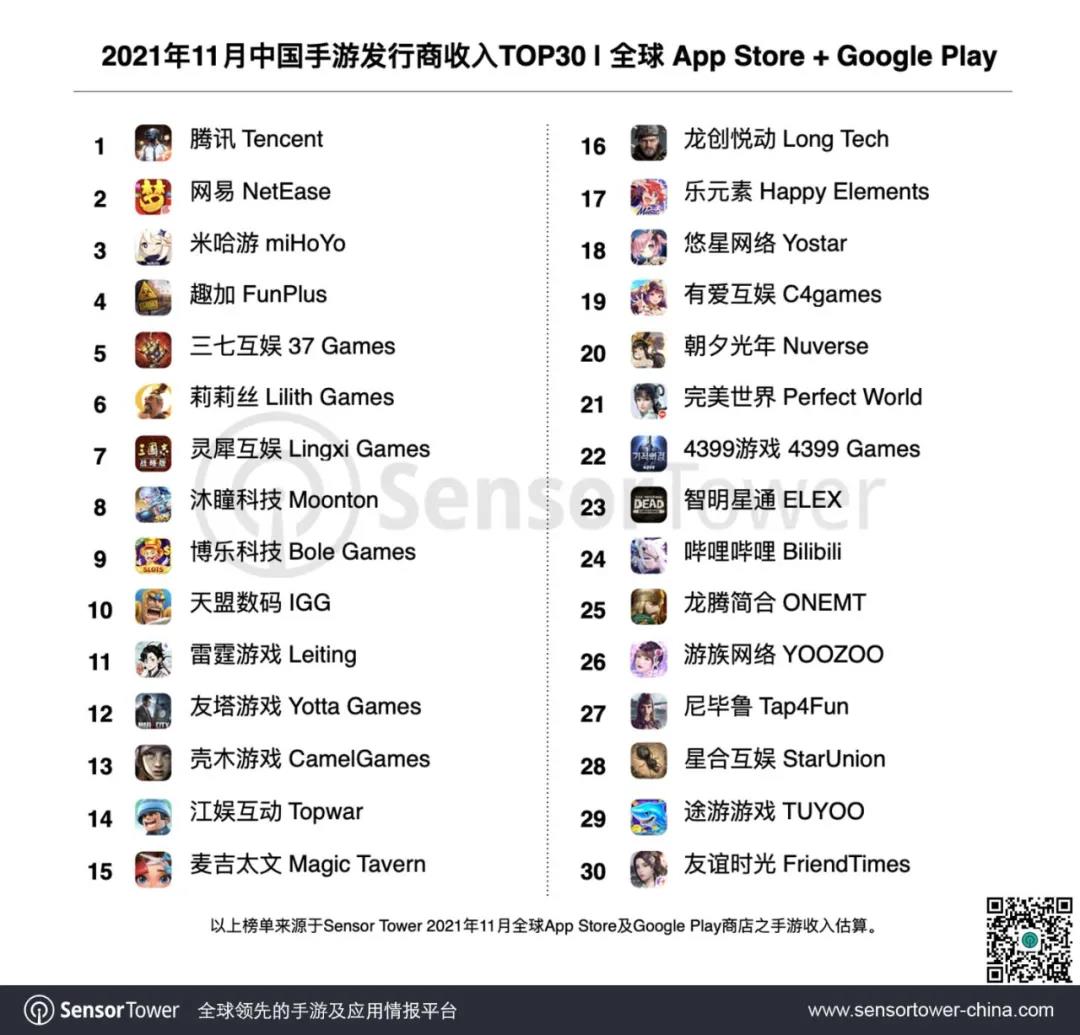Sensor Tower商店情报平台显示,2021年11月中国手游发行商在全球 App Store 和 Google Play 的收入排名。本期共37个中国厂商入围全球手游发行商收入榜TOP100,合计吸金超过22.3亿美元,占全球TOP100手游发行商收入的38.3%,详细报道如下。